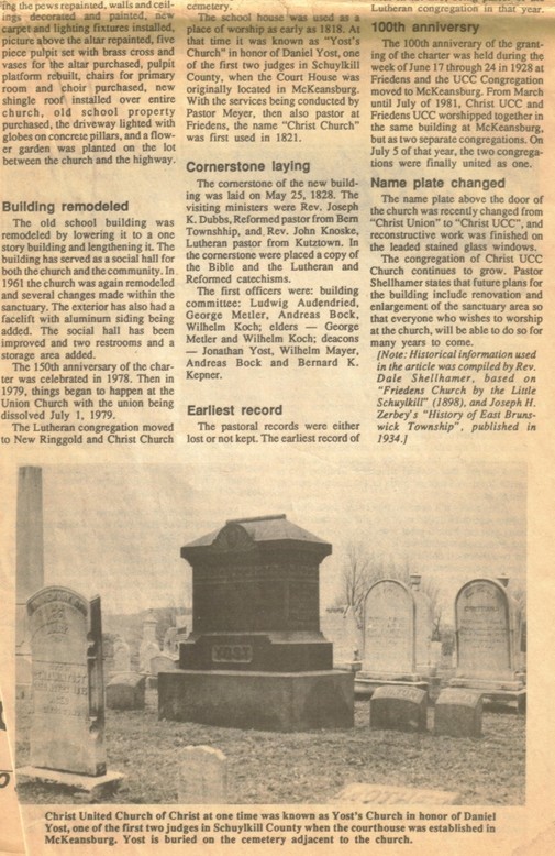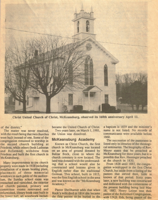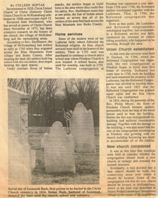 An article printed 04/14/1988 In "The Call, Schuylkill Haven" 160th anniversary of McKeansburg church